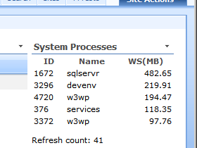 Let’s save our JSON endpoint as %12%\TEMPLATE\LAYOUTS\Get-Process.json.ps1x, which we can test by visiting http://server/_layouts/Get-Process.json.ps1x?n=5. Now it’s AJAX time! Since not everyone can use the ASP.NET AJAX Extensions, we’ll just do it the old-fashioned way. Starting with a Content Editor Web Part on a page of your choice, set the source to the following: